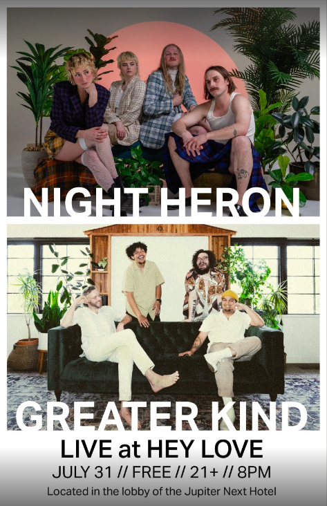 Enjoy a night of jazzy, laid back grooves from Night Heron and virtuosic vibes from Greater Kind, followed by a DJ Set by Lapaushi. The show will take place in the lobby of the Jupiter Next Hotel and is free to the public. Must 21 or older to attend. @greaterkind @nightheronmusic @lapaushi