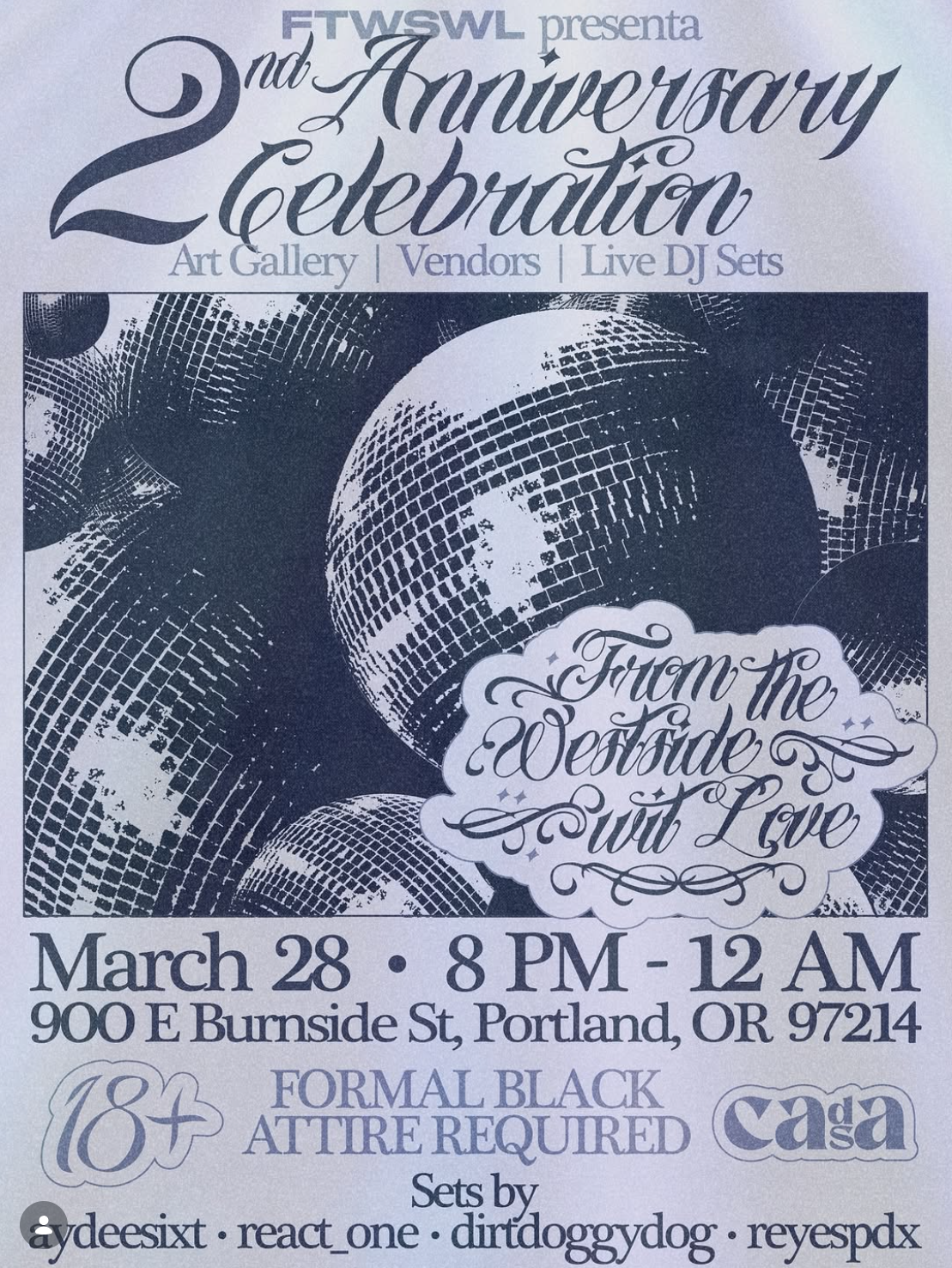 FROM THE WEST SIDE WITH LOVE Saturday, March 28, 2026 9:00 PM 21:00 Sunday, March 29, 2026 1:00 AM 01:00 Hey Love 920 East Burnside Street Portland, OR, 97214 United States (map) Google Calendar ICS Art Gallery, Vendors, Live DJ Sets ATM, Reyes, ALTO @djatm @reyespdx